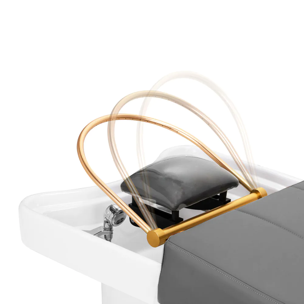 Arcul auriu cu unghi de înclinare reglabil , conceput pentru Waterfall Head SPA, este o soluție inovatoare care permite îngrijirea completă a scalpului . Jeturile de apă acționează ca un masaj natural, îmbunătățind circulația sângelui și reducând tensiunea și stresul. Fluxul de apă controlat cu precizie susține regenerarea părului și hidratează intens pielea. Cascada reglabilă oferă o curățare profundă a scalpului și relaxare, aducând ameliorarea afecțiunilor precum durerile de cap și rigiditatea gâtului. Datorită sistemului inteligent cu buclă închisă , arcul extrage apa din vas și o reutilizează, oferind un masaj continuu cu apă. Această combinație de tehnologie și relaxare susține sănătatea și bunăstarea părului