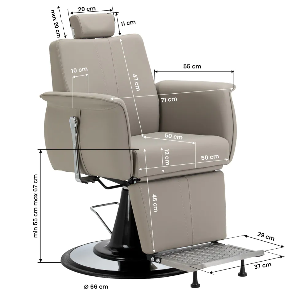 Un sistem hidraulic eficient de ridicare permite reglarea lină a înălțimii scaunului în intervalul 55-67 cm , chiar și atunci când clientul este deja așezat pe scaun. Acest lucru asigură condiții de lucru ergonomice și facilitează ajustarea setărilor la înălțimea atât a clientului, cât și a frizerului. Spătarul rabatabil și suportul reglabil pentru picioare permit plasarea clientului într-o poziție confortabilă, semi-rabatabilă , sporind confortul în timpul serviciilor selectate. Tetiera reglabilă oferă un suport stabil pentru cap și gât .